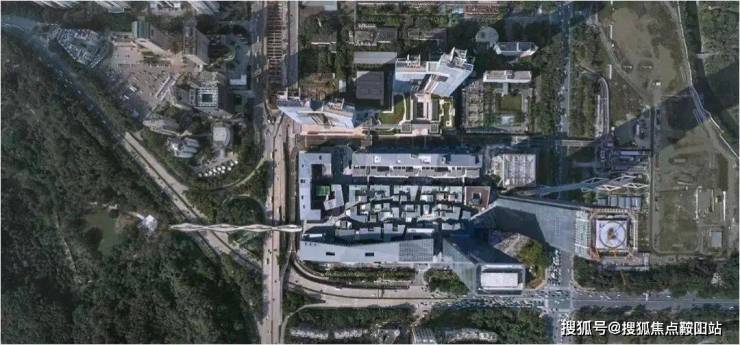 由于基地处于两大自然公园夹心的特殊性,及毗邻深圳CBD、华强北、中心公园的城市背景,规划布局以“缝合原本割裂的城市自然界面”为策略,分别设置两座高架连廊,将莲花山、笔架山两大山体公园联系在一起。