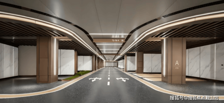 精装车库:全铝板包覆柱体与墙面,全环氧磨石地面一体成型,7米双向车道+6米单向车道。