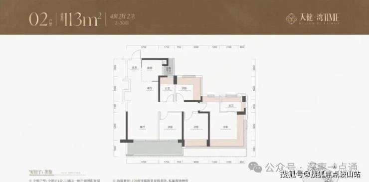 户型为113㎡四房114四房和139㎡五房约290套,2栋100米内30层住宅,2梯5户,其中主力为113㎡四房,整体以朝南及西南为主,有两套朝东北面向金众。
