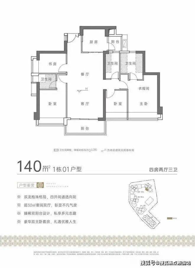 住宅由4栋48层建筑组成,分别是1栋、2栋1/2单元和3栋,3梯5/6户,4栋是商务公寓45F(1470户),5栋是幼儿园。