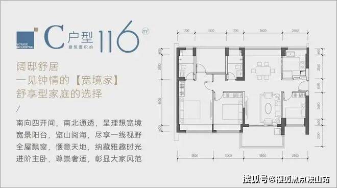 116㎡的4房2厅2卫,C户型,设计的是竖厅南北通透格局,餐客厅一体化设计,客厅3.8米开间,四开间朝南,4个卧室分别做到了主卧17.85㎡/次卧11.4㎡/次卧9.3㎡/次卧8㎡(包含墙体飘窗),都不用搭配飘窗做床,U型厨房,卫生间干湿分离,得房率约:93.13%(包含赠送),阳台主朝西南、东南或正南向。