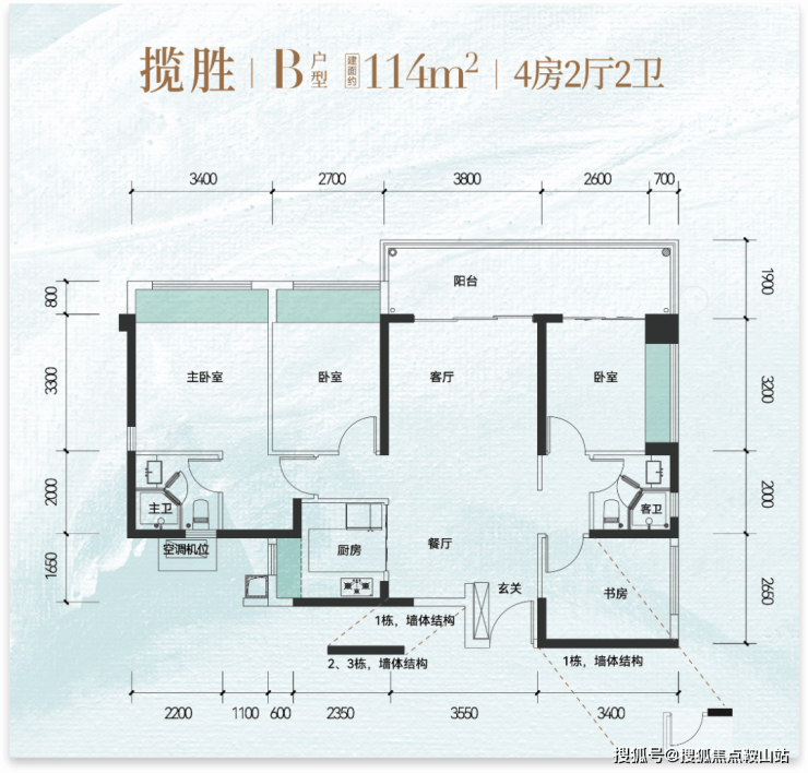 建面约114㎡的4房,是典型双龙抱珠户型,几乎没有过道等“无效空间”,让整个空间利用率更高效。