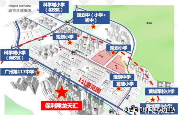 项目约1公里,可步行的范围内,小学有5所(含已规划的一所),包括科学城小学、黄陂小学、黄埔军校小学、联和小学;中学2所,为117中学和黄埔军校中学。(注:学校地段划分以当年教育局公布信息为准)