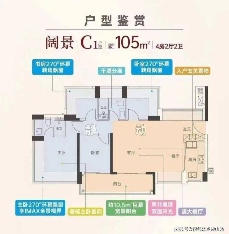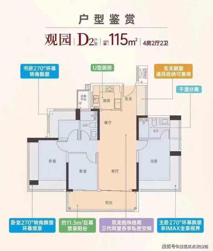 设计的是竖厅双龙抱珠格局,客厅3.5米开间,四开间朝南,分别做到了主卧18.33㎡/次卧17.28㎡/次卧10.36㎡/次卧7.41㎡(包含墙体飘窗),U型厨房,卫生间干湿分离,还带1个设备平台,得房率约100%(包含赠送),客厅连接次卧出11.34㎡的大阳台,西南朝向。赠送面积约27.59㎡。