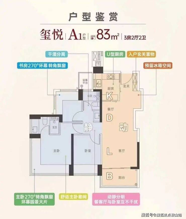 设计的是竖厅格局,客厅3.4米开间,LDKB一体化,S墙设计预留冰箱卡槽位,动静分区,主卧270°无柱转角飘窗,分别做到了主卧16.53㎡/次卧9.62㎡/次卧6.63㎡(包含墙体飘窗),U型厨房,公卫三段式干湿分离,还带1个设备平台,得房率约100%(包含赠送),首推的1/2栋东北朝向。赠送面积约13.74㎡。