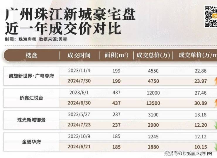 不妨先看向二手市场,以广州珠江新城为例,产品品质、居住圈层等方面更出色的凯旋新世界、汇悦台等,成交价均保持稳步上涨,而位于相同位置,与这两个盘相邻的其他豪宅盘,却难掩下滑态势。