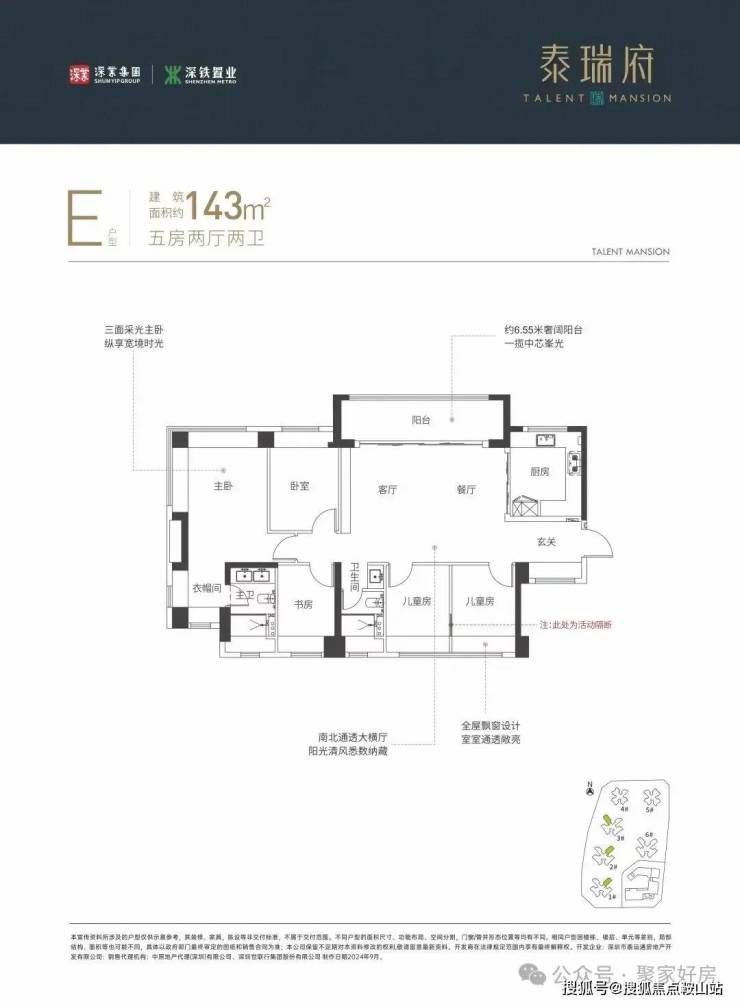 横厅南北通透格局,客餐厅6.55米开间,5个卧室分别做到了主卧20.71㎡/次卧9.25㎡/次卧7.9㎡/次卧7.89㎡/次卧6.69㎡(实测面积),得房率:77.48%(不含赠送),阳台主朝东南或西南向。加上赠送后得房率约93.51%。