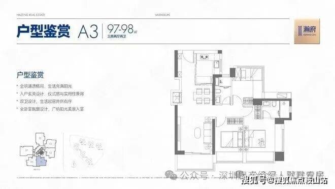 96-97㎡3房2厅2卫02(A1)户型,设计的是竖厅两个半开间朝东南,客厅开间3.5米,LDKB一体化,S墙设计预留冰箱卡槽位,动静分区,次卧东北向。