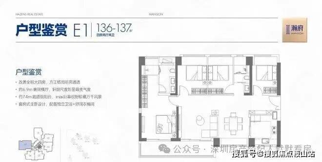 136-137㎡4房2厅2卫07(E1)户型,设计的是横厅朝西南,客餐厅开间6.9米开间,LDKB一体化设计,四开间朝南,全屋7面飘窗,主卧套房+步入式衣帽间,3个次卧朝东北向,客厅连接次卧出7.4米长的超大阳台。
