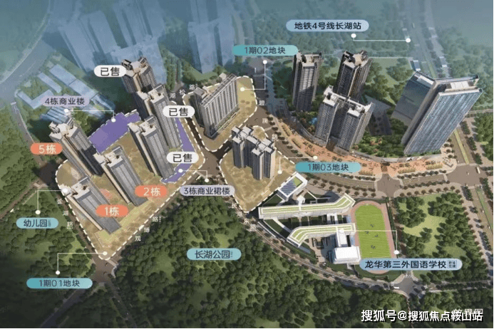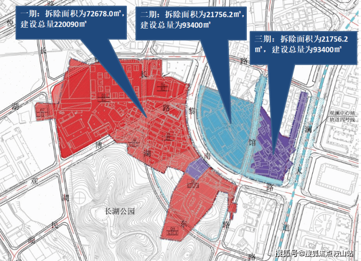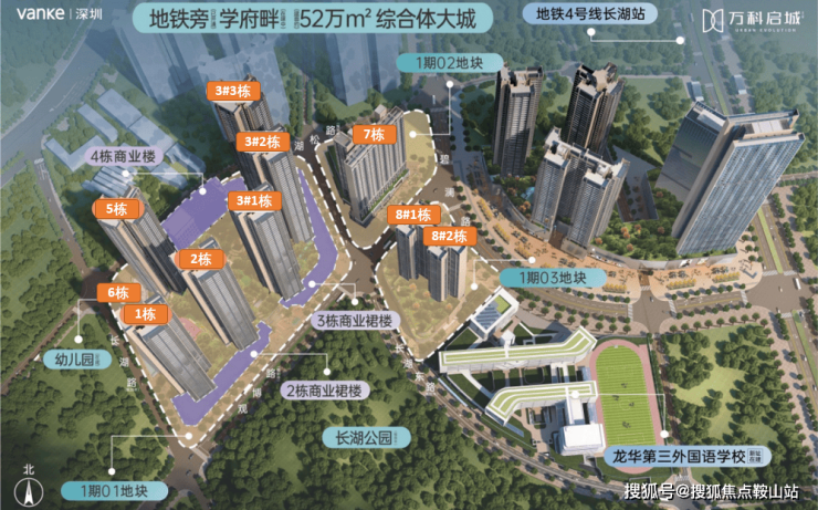 《万科启城》位于龙华区福城街道,项目地块原为长湖头村旧改更新单元,拆除用地面积10.65万㎡,是观澜最大的旧改项目之一,涉及富民及新和两社区。更新单元于2011年列入城市更新计划,2015年旧改范围内的部分建筑开始拆除,2020年龙华区成立三周年举办了首批重点项目集中开工仪式,万科的长湖头村旧改项目位列其中,至此项目才开始正式大规模拆除建设。根据规划,长湖头村旧改项目分为三期建设,根据此前公开资料显示,图中红颜色部分为一期拆除及建设范围,九年一贯制长湖学校也在其中,位于一期的最南端;图中蓝色部分为二期拆除及建设范围;图中紫色部分为三期拆除及建设范围。整体建成后,将是集住宅、商业、学校、公共配套于一体的大型综合社区。