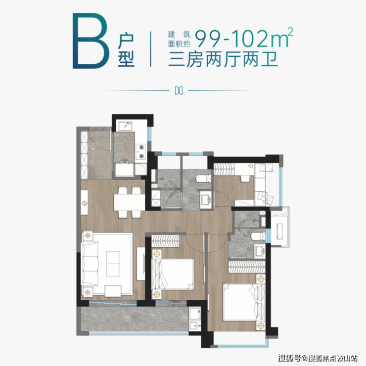B户型:建面约99-102㎡三房两厅两卫,经典竖厅设计,全明格局,动静分区合理,约6.1米面宽景观大阳台,纵享绿色生态景观,全明超大主卧套间,私享卫浴及步入式衣帽间,科学布局8大收纳空间,空间使用率高,双次卧,满足三代同堂需求。