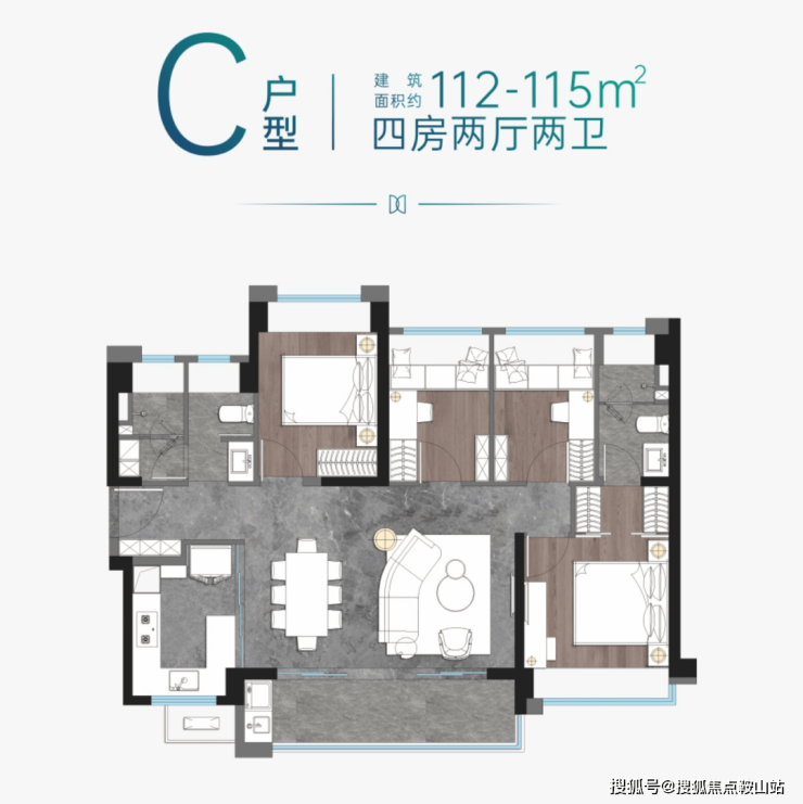 C户型:建面约112-115㎡四房两厅两卫,开阔景观横厅设计,格局通透,动静分区,约6米面宽大气景观阳台,包揽四季风光,LDK一体化中西厨房,有格调的人间烟火,双孩房,长辈房双边下床,尽心呵护家人,首置、改善,一步到位。