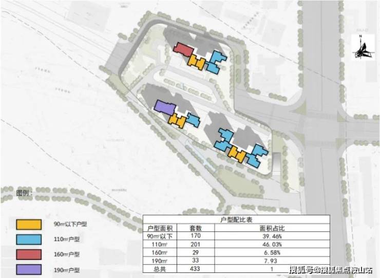 规划总户数433户,整体布局2梯4户,2梯5户,2梯6户。