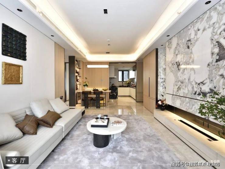 (3)归家礼序:创新"三重云门"归家体系,主入口打造12米挑空云顶大堂,地面采用蓝金沙大理石拼花。车库入口设计星空顶棚,1784个车位全部配备智能导视系统,车道采用环氧磨石材质镶嵌铜质分隔线。