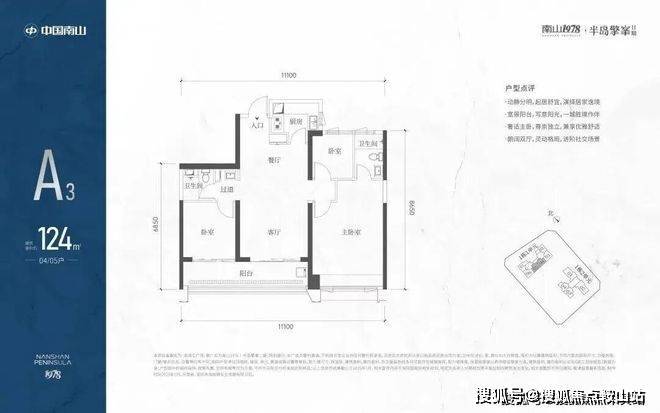 A3也是两条腿,分别是1-1栋04/05,主朝向是东南向,双龙抱珠格局。客厅拥有超大观景阳台,缺点是公卫是个暗卫,小次卧和主卫也对天井外走廊,采光不足。