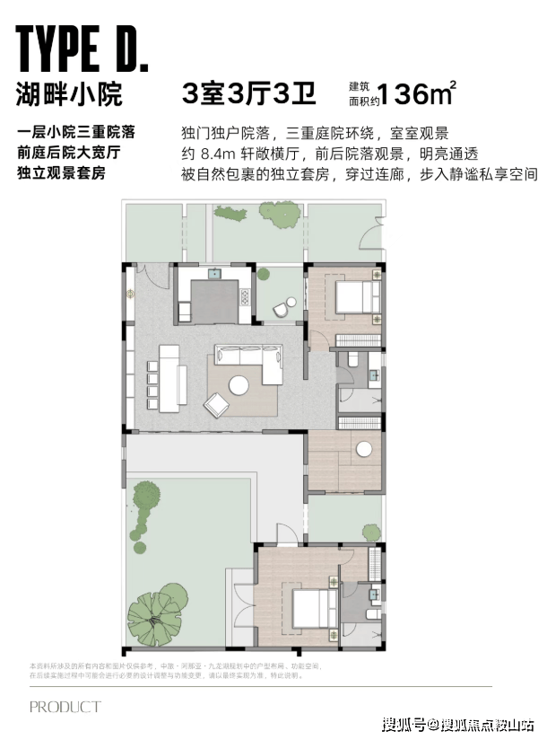 湖畔小院,湖居生活的发生地▪️面积共计可达约98㎡的多重庭院,围绕室内空间灵活分布,每个房间都与室外自由连通,流动的空间,带来通透的采光和灵动的自然光影。▪️湖畔小院,是阿那亚小院在湖居维度的全新探索。基于阿那亚受欢迎程度非常高的小院产品系,湖之屿结合广州项目的特性,以小院的建筑形态,为人与自然创造更多交流的机会。▪️平层院落的建筑形态,白墙红瓦的质朴美学,简洁优美的建筑线条和邻里街巷的围合感,传递出别有韵味的诗意和美感。▪️舒朗的层高,落地窗和高窗,带来 良好的采光和视野。廊架、庭院、 天井,则是基于南方生活的考量, 因地制宜设计的通透空间,身处 其间,感受与自然无限亲近的小院生活。