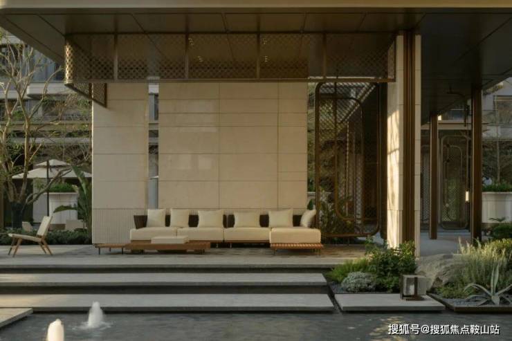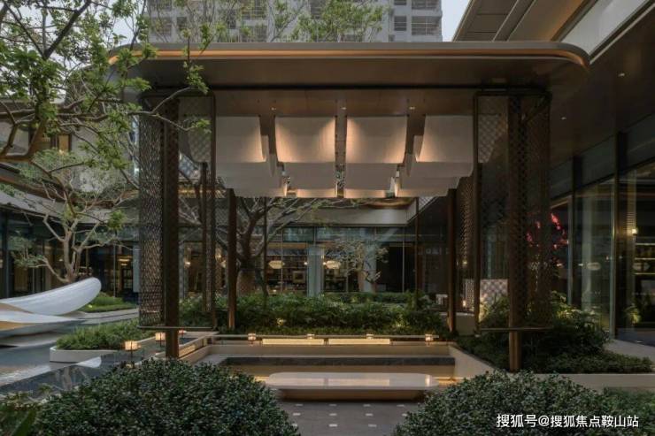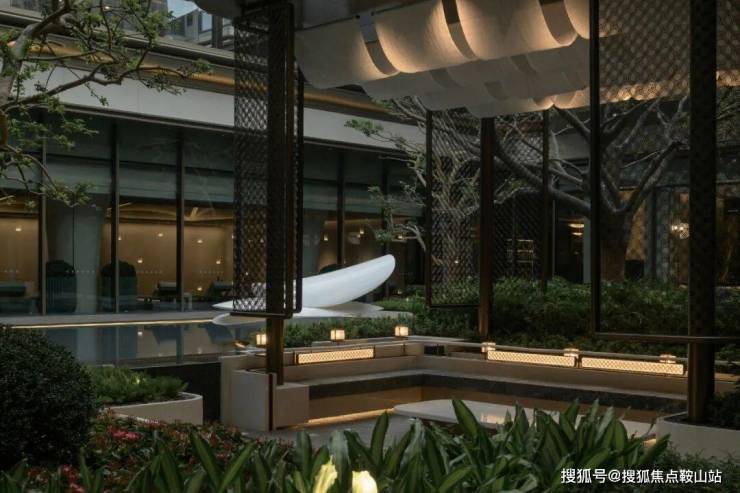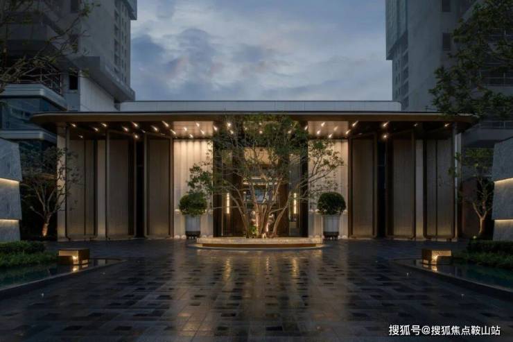 “玉阙巍峨立云间,主门洞开迎春江”。酒店式入口以仪式感水景开场,人车分流动线隐现尊崇。海浪灰石材与香槟金金属格栅交叠,光影流转间,仿若踏入一幅流动的东方画卷。礼宾环岛由白冰玉石与玉树·古桩铁冬青相互交织,以黎族织锦为灵感,光影交错,展示海南文化深厚底蕴。主两侧景墙后两棵特选雨树,高约12m,枝叶繁茂如伞状撑开,搭配艺术灯具点缀,归家的每一步,皆是身份的礼赞。