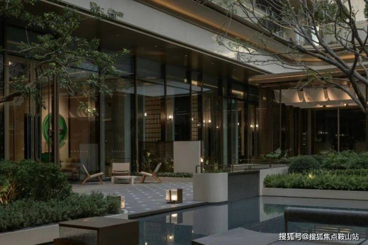 下沉庭院是献给都市人的精神绿洲。“玉庭幽深映碧泉,锁住云烟锁住闲”。私密洽谈区与共享会客厅隐于碧水与风雨连廊之间,四棵铁冬青环绕一棵巨形朴树,枝影摇曳,仿海洋蓝陶瓷砖映着波光,勾勒出“大隐于市”的静谧画卷。一杯咖啡、一池静水,时光在此慢了下来。