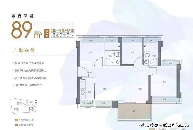 89㎡的3房2厅2卫横厅南北通透格局,客餐厅5.8米开间,LDKB一体化,四开间朝南,主卧双飘窗南北通设计,L型厨房,卫生间干湿分离,得房率约90%(包含赠送),阳台主朝西南或东南向。