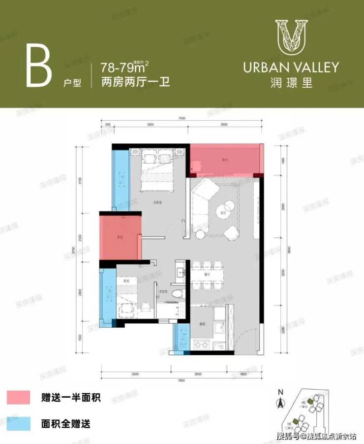 79㎡的3房2厅1卫,设计的是竖厅格局,LDKB客厅一体化设计,客厅3.5米开间,3个卧室分别做到了3.2米/2.8米/2.3米的宽度,U型厨房,卫生间三段式分离,得房率:74.44%(不含赠送),阳台都是东南朝向。