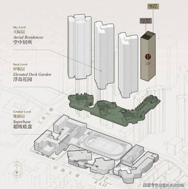 承迹景观在后海招商玺的景观设计中,创新采用“浮岛甲板”立体空间规划,借鉴香港、新加坡的垂直复合开发智慧,构建起“超级底盘 + 悬浮花园”的独特格局,重新定义了豪宅生活的边界与丰盈。