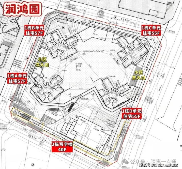 后面要入市的润鸿园,总占地面积约2.1万㎡,总建筑面积约25.97万㎡,计容建筑面积约19.3万㎡,容积率8.33,绿化率30.01%,共由4栋总高55-57层高的住宅组成,其中1栋A/B单元住宅57F,1栋C/D单元住宅55F,2栋是写字楼40F,是独立于小区之外的。