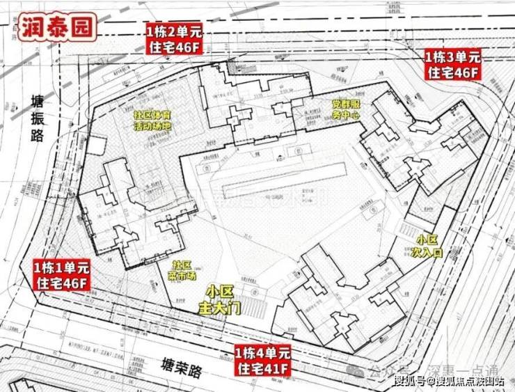 后面要入市的润泰园,总占地面积约1.4万㎡,总建筑面积约14.68万㎡,计容建筑面积约10.51万㎡,容积率6.74,绿化率40.01%,共由4栋总高41-46层高的住宅组成,其中1栋1/2/3单元住宅46层,1栋4单元住宅41F,配建有社区医院+菜市场。