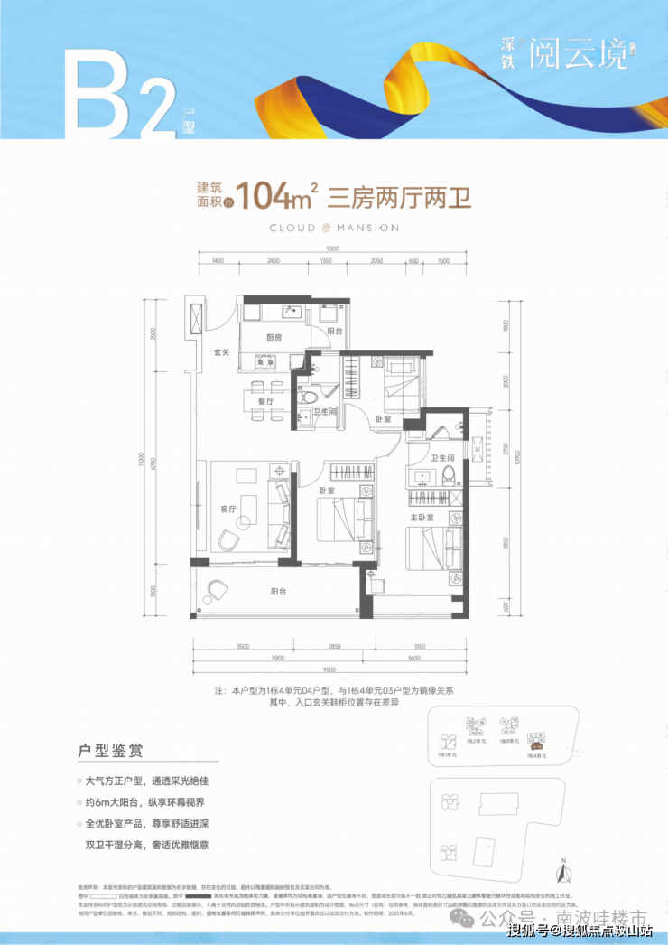 104㎡的3房2厅2卫,B2-1栋4单元03.04户型,设计的是经典竖厅格局,进门入户玄关,客厅3.5米开间,LDKB一体化,S墙设计预留冰箱卡槽位,三开间朝南,动静分区,3个卧室分别做到了主卧16.1㎡/次卧9.12/次卧6.89㎡(包含墙体飘窗),二字型厨房带1个2.43㎡大的生活阳台,卫生间干湿分离,得房率79.2%(不含赠送),客厅连接次卧出11.43㎡大阳台,正南朝向。套内面积82.37㎡+赠送面积10.14㎡=实际使用面积92.51㎡,加上赠送后得房率约88.95%。
