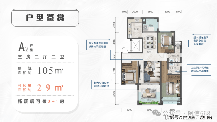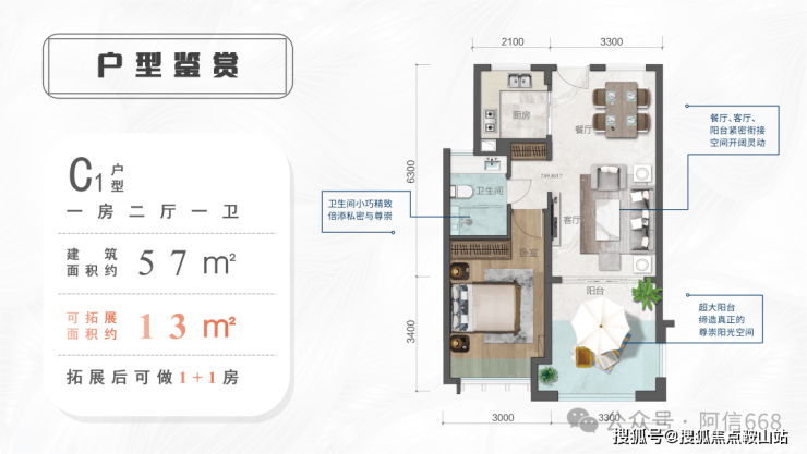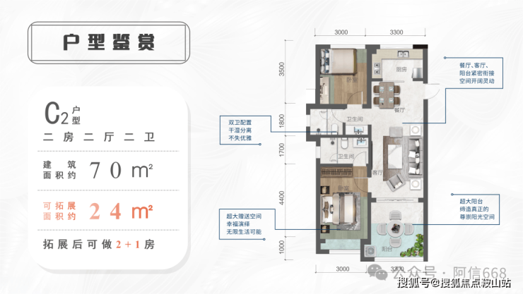 〖C2户型〗建筑面积:约70㎡拓展面积:约24㎡户型格局:二室二厅二卫(可改2+1房)
