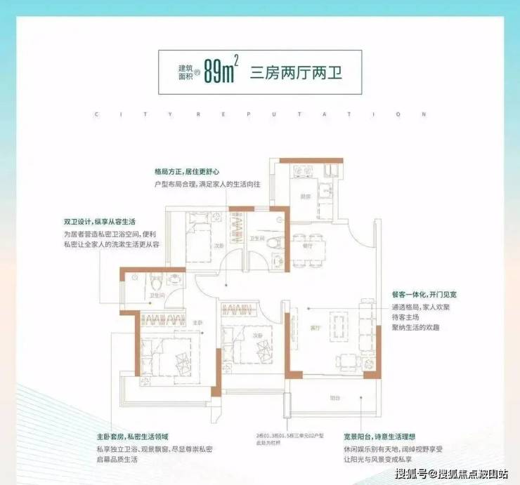 89㎡的3房2厅2卫:有2个户型,1个设计的经典竖厅格局,有西南及东南朝向;1个设计的竖厅南北通透格局,U型厨房。