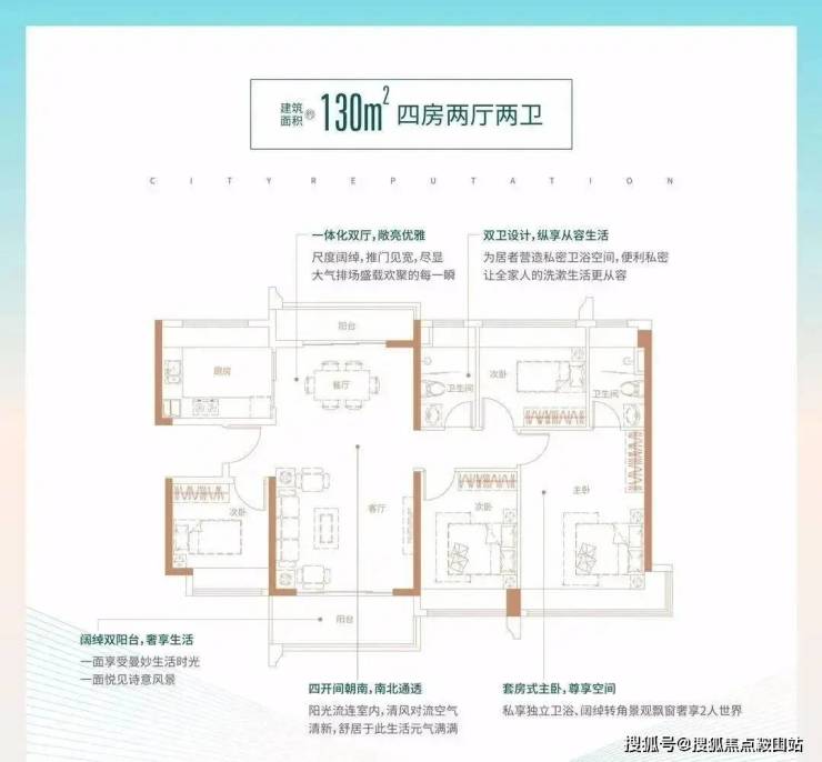 130㎡的4房2厅2卫:设计的竖厅格局,双阳台南北通透,4开间朝南。