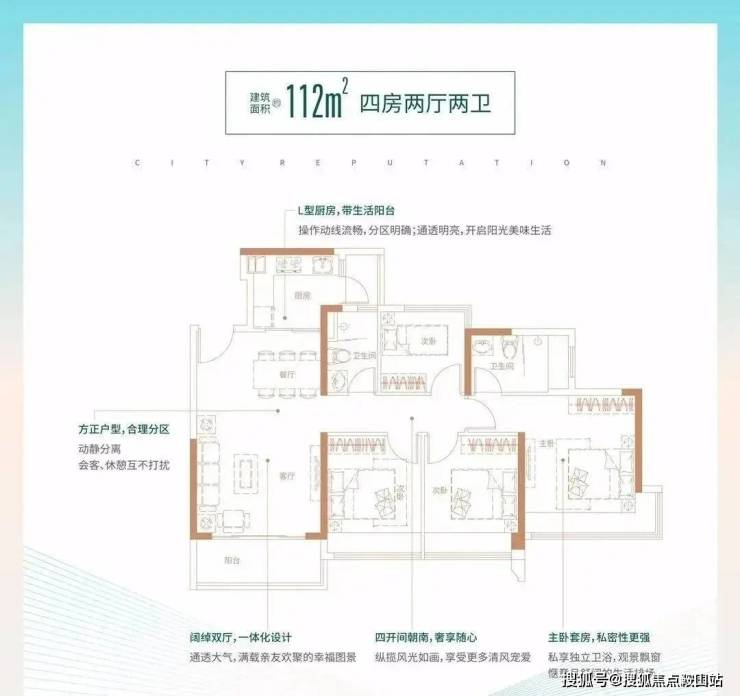 112㎡的4房2厅2卫:设计的竖厅格局,L型厨房,都是东南朝向。