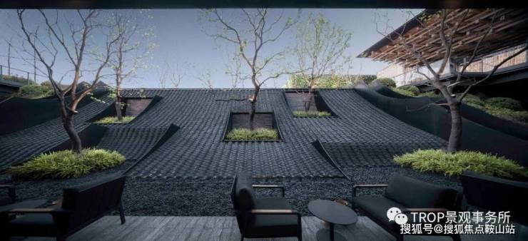 起伏的地形之间,隐藏着一系列小尺度的口袋空间,为人们提供安静停留的瞬间。另一侧,深色调的泳池映射着山体与天空,形成一幅随时间变化的景观画面。