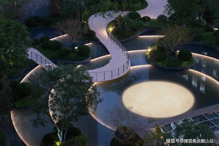 上方,一座步行桥将各个空间串联起来,成为主要的游览与通行动线;部分路径通向隐藏在林中的亭子——有时被薄雾环绕,有时在夜色中如灯笼般柔和发光。