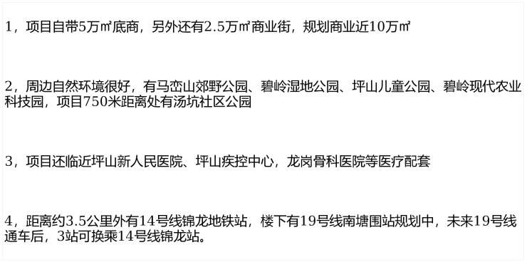 轨道交通方面,项目距离约3.5公里外有14号线锦龙地铁站,距离较远,业主通行较为不便。
