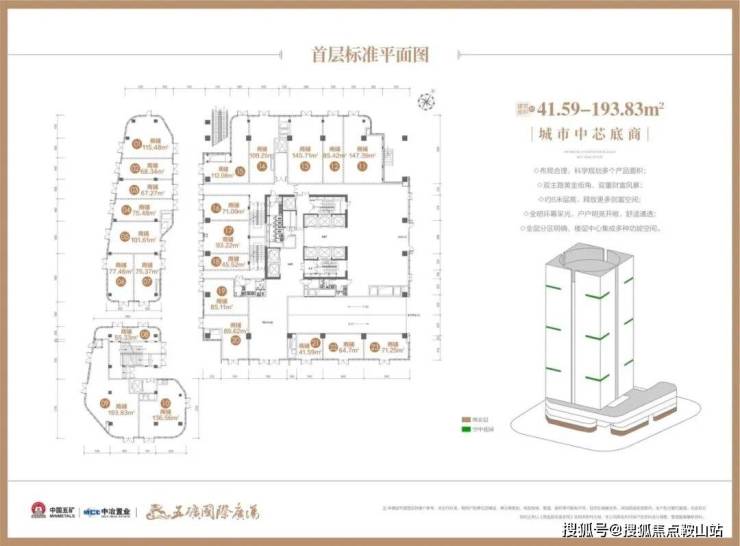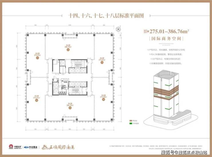【楼栋概况】楼体高度110米,地下二层地上22层,1-4层为城市中芯底商,首层层高约6米、2层层高约为4.5米、3/4层层高约为4.35米;5至18层为国际商务空间,层高约为4.2米。