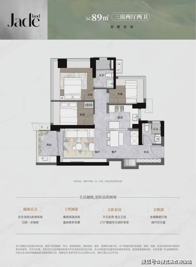 89㎡的3房2厅2卫,设计的是经典竖厅格局,进门入户玄关,LDKB一体化,S墙设计预留冰箱卡槽位,三开间朝南,主卧+1个次卧270度飘窗,L型灵动式厨房,卫生间干湿分离,得房率约89.35%(包含赠送),西南或东南朝向。