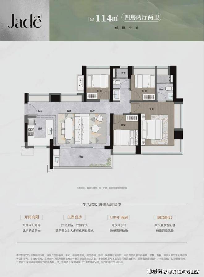 114平㎡的4房2厅2卫,设计的是横厅南北通透格局,进门入户玄关,LDKB一体化,五开间朝南,全屋9面飘窗,主卧大套间,U型厨房,卫生间干湿式分离,得房率约93.18%(包含赠送),阳台主朝东南向。