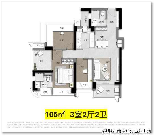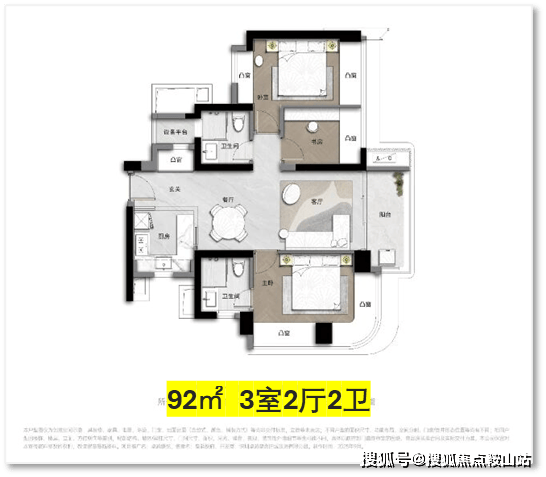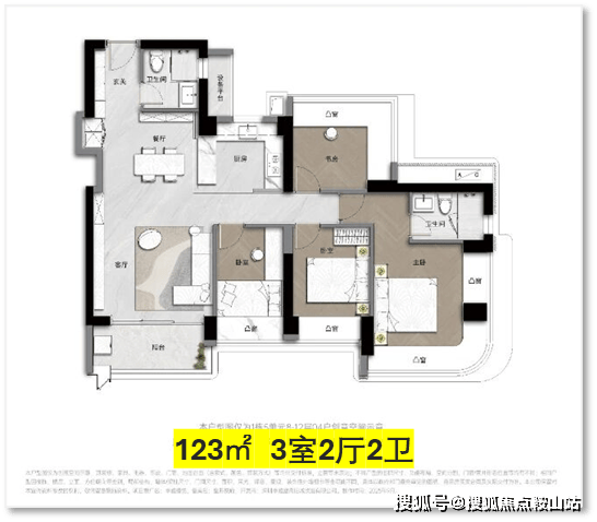 竖厅、4开间朝南、主卧270°凸窗朝南,北次卧与92㎡户型主卧对视。