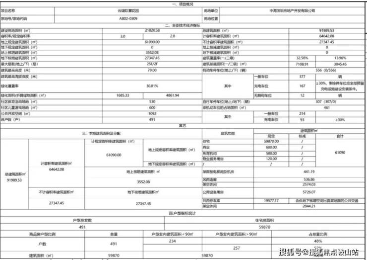 中海云颂玖章位于龙华区梅林关书香门第旁,土地面积21820.58㎡,规划建筑面积61090㎡(其中住宅59870㎡、商业600㎡、托育机构500㎡、物业服务用房120㎡),容积率2.8。总规划491户,停车位556个,从平面图来看大概率是2梯4跟2梯5户设计