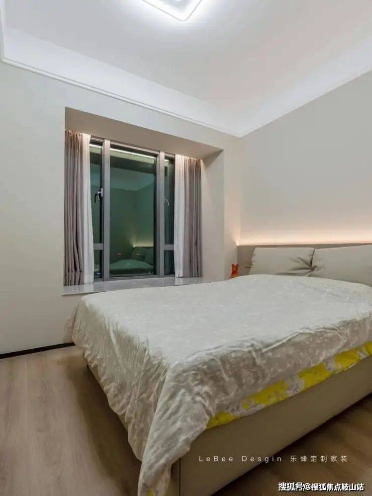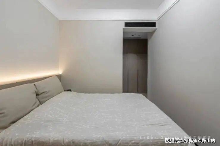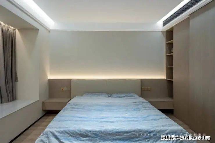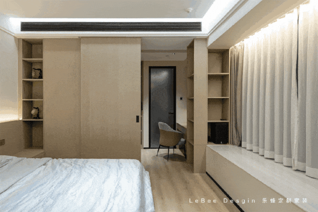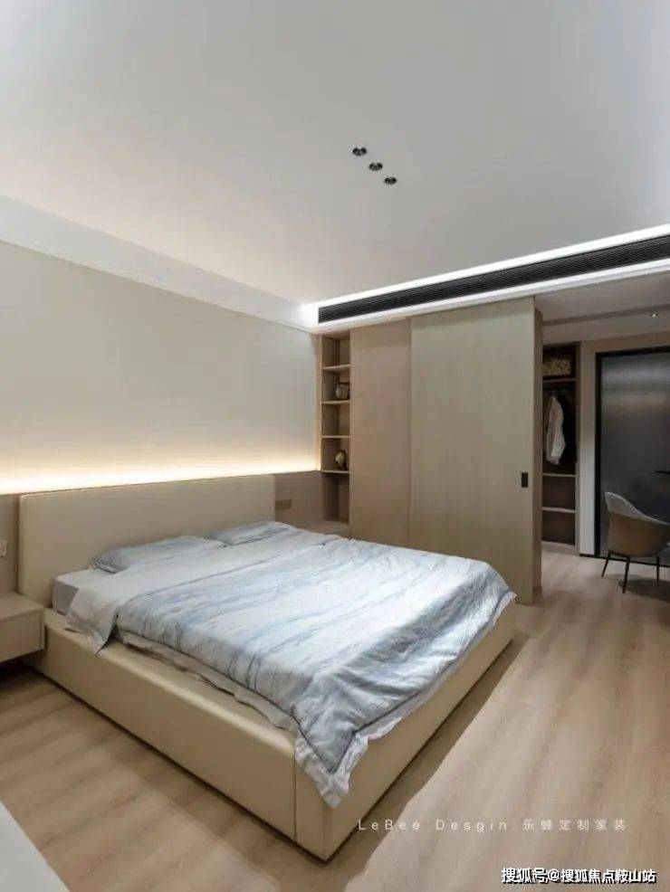 主卧延续客厅的风格,以浅咖色为主基调,床头不做复杂造型,做半墙背景,内嵌灯带,增加层次感的同时,也增加了照明,氛围感超好。