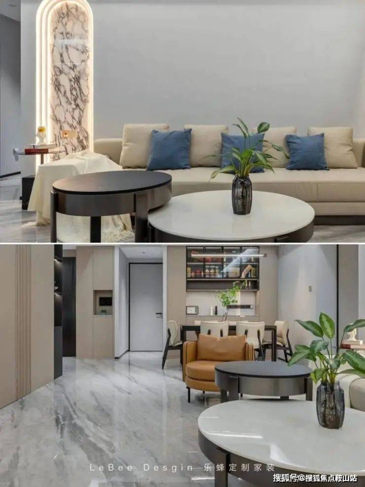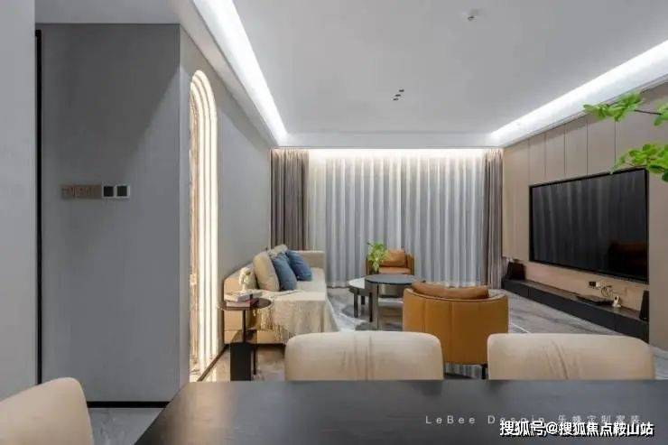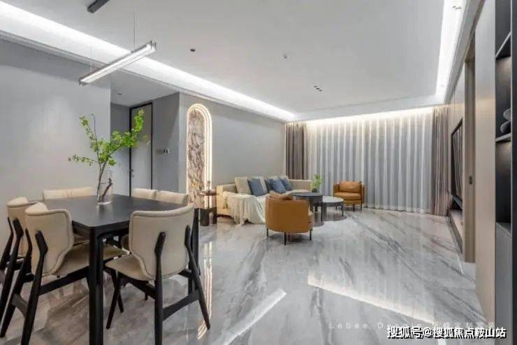 客餐厅选择了无主灯吊顶,顶面的空间更加舒展和平整。地面选择大砖通铺,延伸感得到加强。