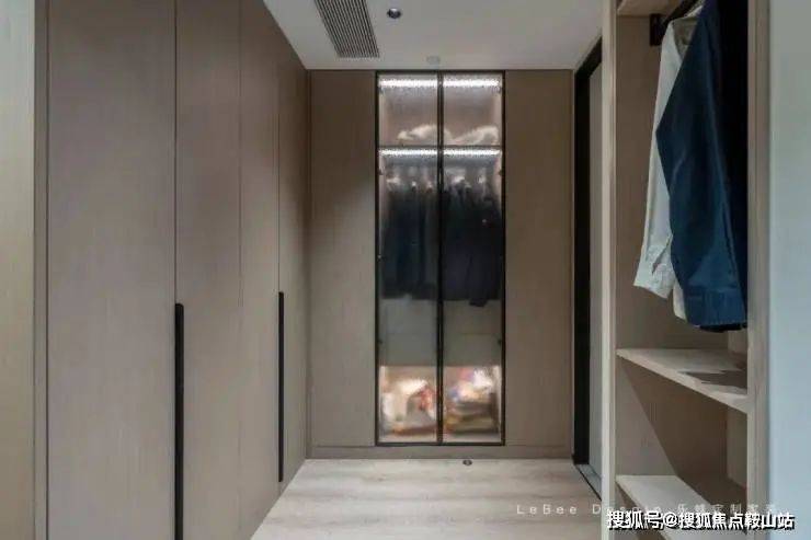 衣帽间就要利用到极致!衣帽间一侧是封闭柜体设计,一侧是开放式的布局,让每一件衣服、每一双鞋都井然有序地展现在你面前,木色的封闭柜体搭配玻璃层板和灯光,既简洁又时尚美观又方便拿取衣物。