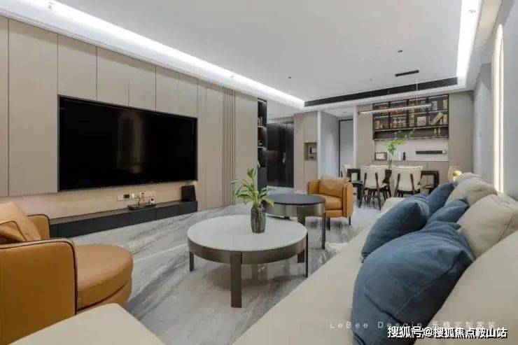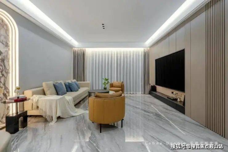 电视背景墙不做复杂的造型设计,使用墙板,格栅,岩板等不同材质再加灯光点缀,层次感和立体感拉满。全部搭配反弹器、地面使用哑光砖通铺法,让整个空间的视觉感干净又大气而且很能装。