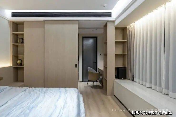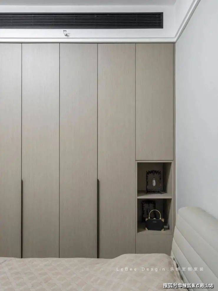奶咖色的衣柜,无拉手设计高级又耐看,侧柜做了2个开放格,空间不会显得很压抑。