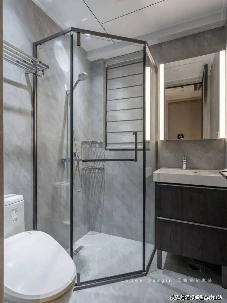 钻石型淋浴房几何的空间感,也让小面积空间可以更好布局。整体卫生间地面选用灰白砖进行随铺贴,让空间更具现代的时尚感。窄边黑框、玻璃隔断组成的钻石型淋浴房,几何的空间感搭配氛围灯带,显得科技感十足。