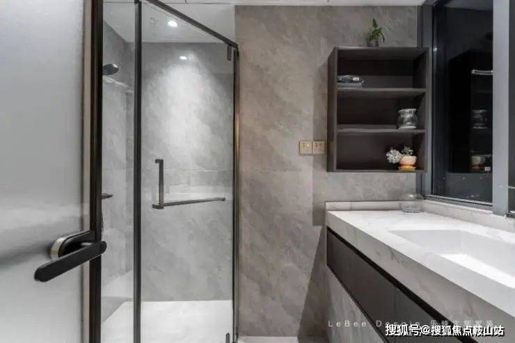 次卧卫生间的墙面地面都选择灰色瓷砖,简约又不失质感,临窗的钻石淋浴房,有效实现干湿分离,木色浴室柜搭上白色大理石台面,真的绝绝子~柜体双层抽屉设计,收纳值拉满~