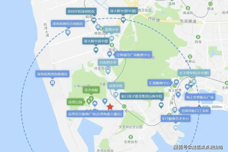 3km 范围内的配套资源包括赤湾学校、月亮湾小学、太子湾学校、深大附中(教育),K11 购物艺术中心、海上世界船头广场、嘉盛荟商业中心、泛海城市广场(商业)等。
