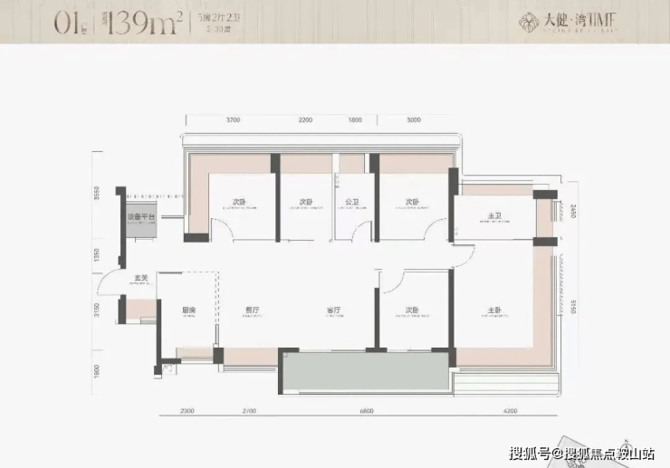建面约115㎡四房与139㎡五房户型,都是横厅设计,户型基本一致,区别在于139㎡多了一个房间。