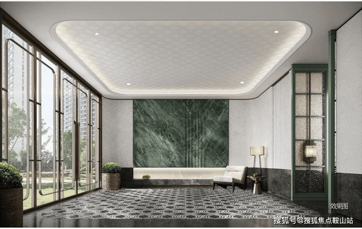 步入楼栋礼序前庭,方胜纹拼花地面如展开的琳琅画卷,精工打造的每道棱线皆诉说着世家的仪式尊荣。立面点缀长条发光白玉石以及天珺特色奢石猫眼绿,于端庄格局中透射温润辉光。方胜图腾在此升华为门庭的家族徽章,以大地为宣纸,镌刻归家的首重礼赞。